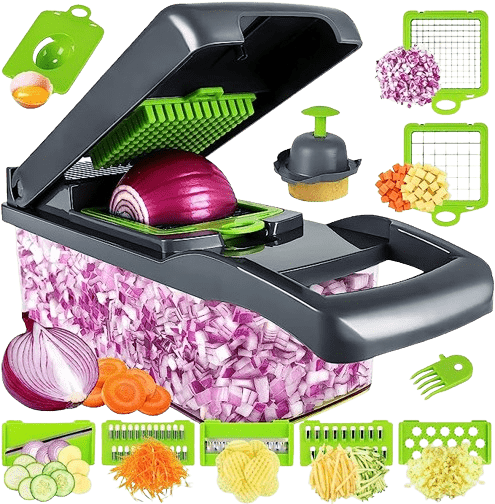Lei av å bruke timer på å hakke grønnsaker? VivaSlice Pro gjør det raskt og enkelt! Med 8 utskiftbare blader skiver, hakker og river den mye raskere enn en vanlig kniv eller hakker.