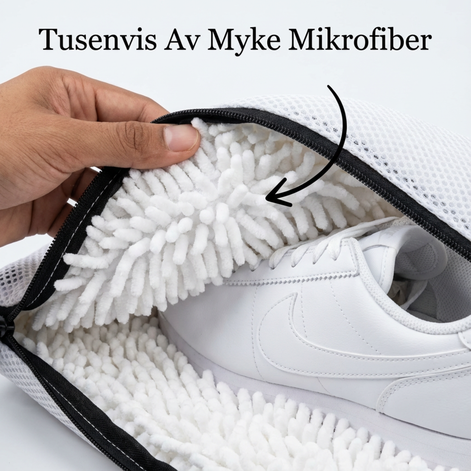 Vår Skotvättpåse är det säkra sättet att rengöra dina skor.Tusentals mjuka fibrer skrubbar bort smuts samtidigt som både dina skor och din tvättmaskin skyddas.