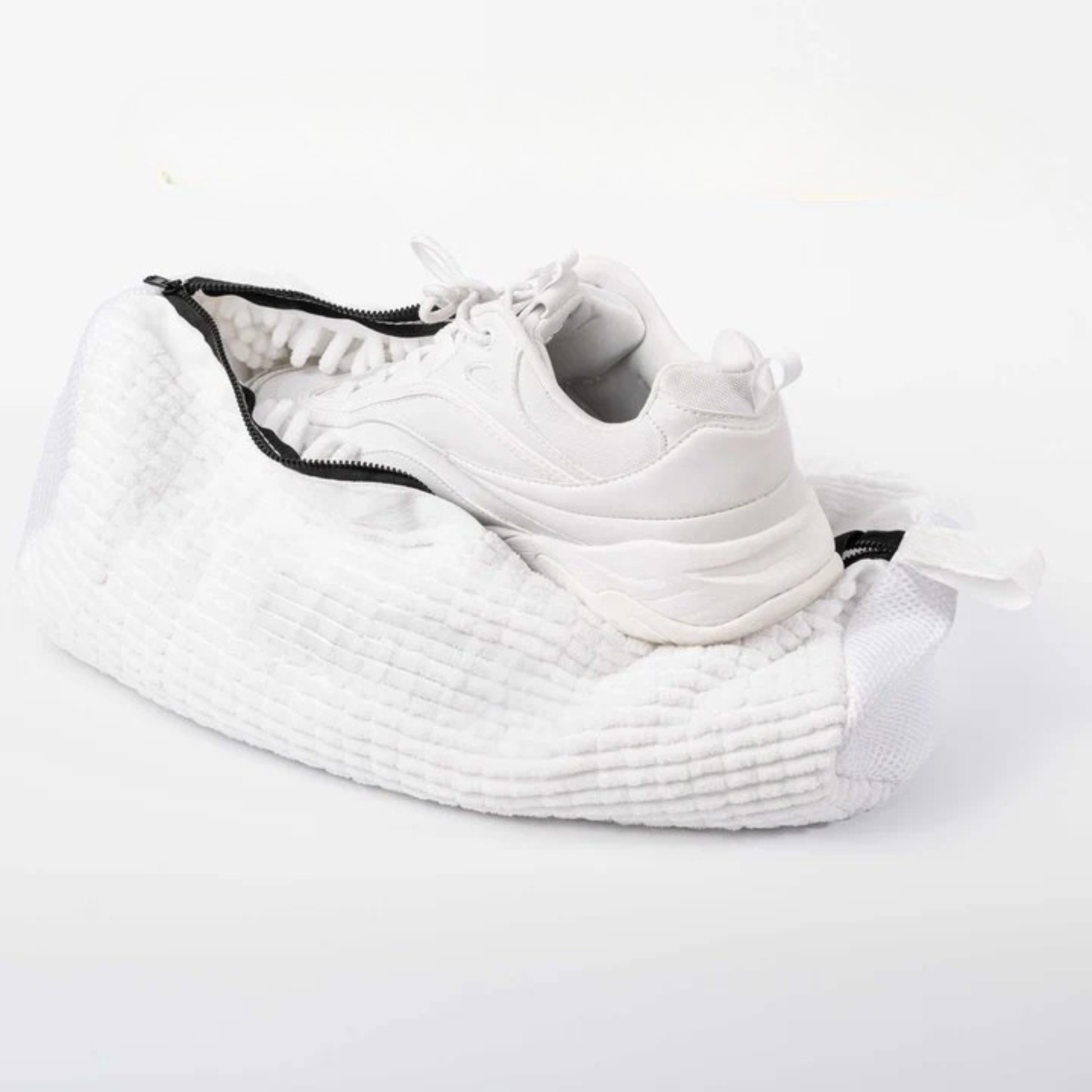 Med vår skoväska tar det bara några sekunder.Lägg bara varje sko i sin egen påse, dra igen dragkedjan och släng den i tvättmaskinen.Inuti påsen fungerar tusentals ultramjuka fibrer som små borstar som skrubbar bort smuts och fläckar från alla håll. Samtidigt skyddar de dina gympaskor så att de inte slår i, töjs ut eller tappar formen, och din tvättmaskin hålls också skyddad.